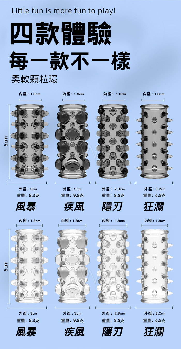 探索者.大顆粒刺激摩擦快感鎖精延時狼牙套-4入裝【透黑】