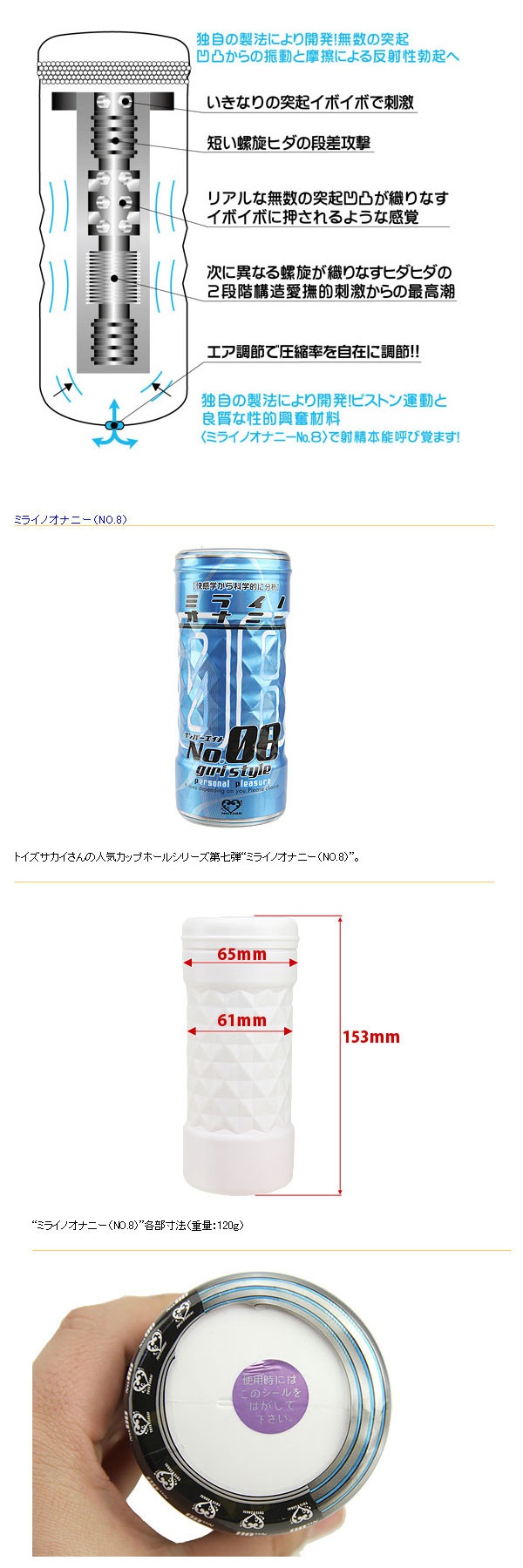 螺旋ヒダによる振動や摩擦から反射性勃起へ導く。今までのミライシリーズのシリコン素材、容器素材を一新し、シリコン素材、容器素材ともにハードタイプになっており、今までのミライシリーズとは一味違う!ハードカップによるハードタイプの刺激が、射精本能を呼び覚ます!