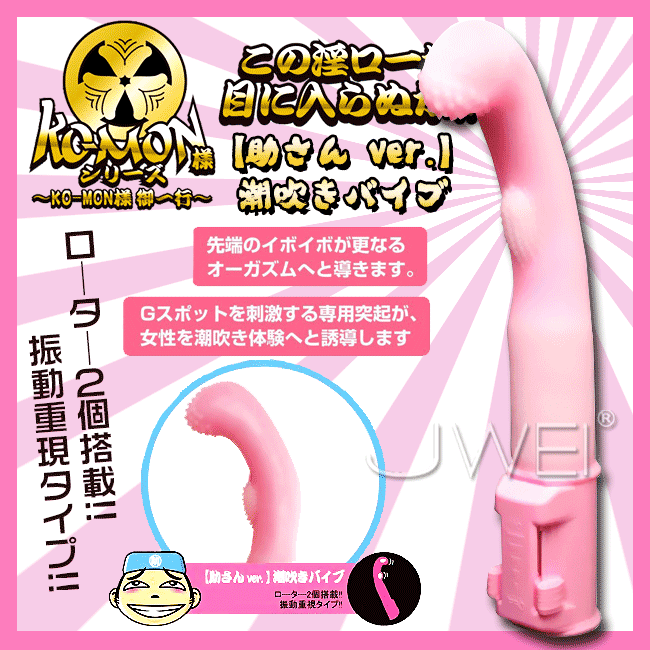 皆のもの控えおろう〜!この淫ローが目に入らぬか!!膣を徹底研究し、潮吹きに特化したバイブは助さんver!待望のKO-MON様シリーズ3種類が同時発売!!膣を徹底研究、“女性の射精”と呼ばれる“潮吹き”が可能に!潮吹きを誘発する秘密のポイントを8cmのしなりカーブと搭載されたツインローターが絶妙な角度でじんわりと潮ポイントを刺激。先端のイボイボが更なるオーガズムへと導きます。助さんのアシストでイキやすい体に大変身!