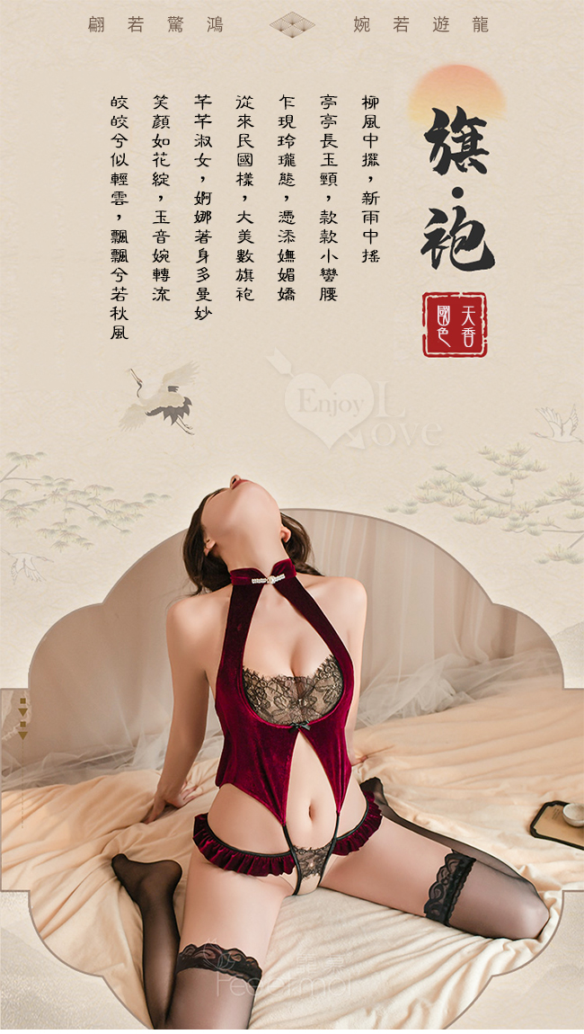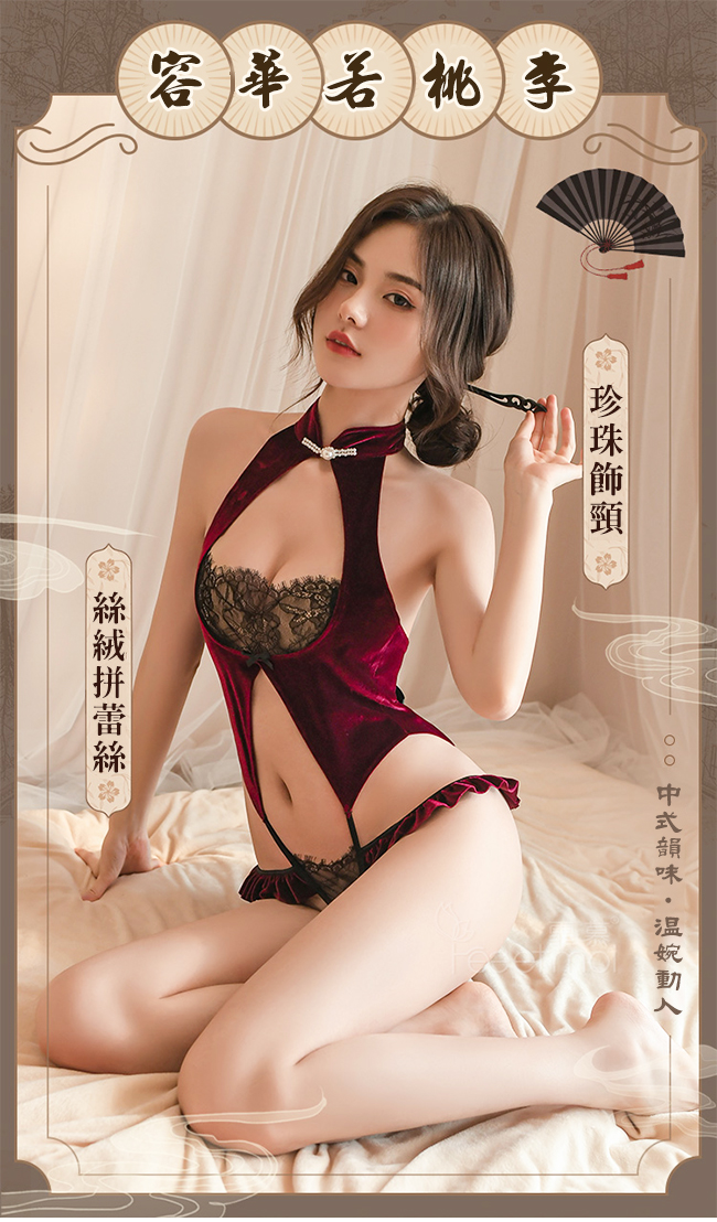 ►您現在的位置:首頁>仿旗袍睡衣!一字珍珠領絲絨拼接蕾絲開襠免脫連身衣兩件組