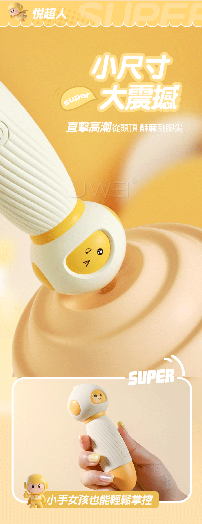 SUPER!!萌物猛攻~悅超人震動棒!玩轉“高潮”~~ 老司機只選AV棒,蜜豆刺激才是真高潮,悅超人一觸即潮! 超強震動12000轉/min急速猛烈,48mm球頭直徑,覆蓋面大狂暴刺激感 直擊高潮,從頭頂酥麻到腳尖!獨特小觸角花式撩逗,感受別樣刺激! ■尺寸:大小詳如圖片標示 ■材質:矽膠、ABS ■供電:USB直插充電 ■特色:10段震動