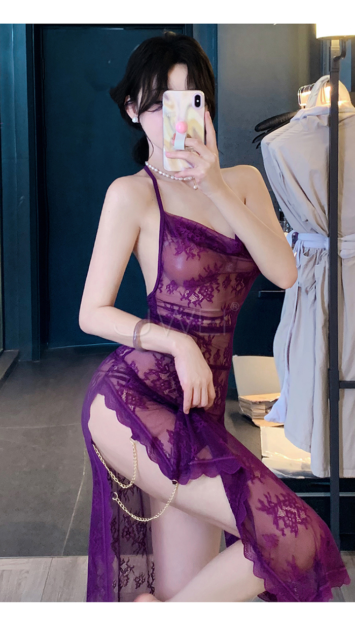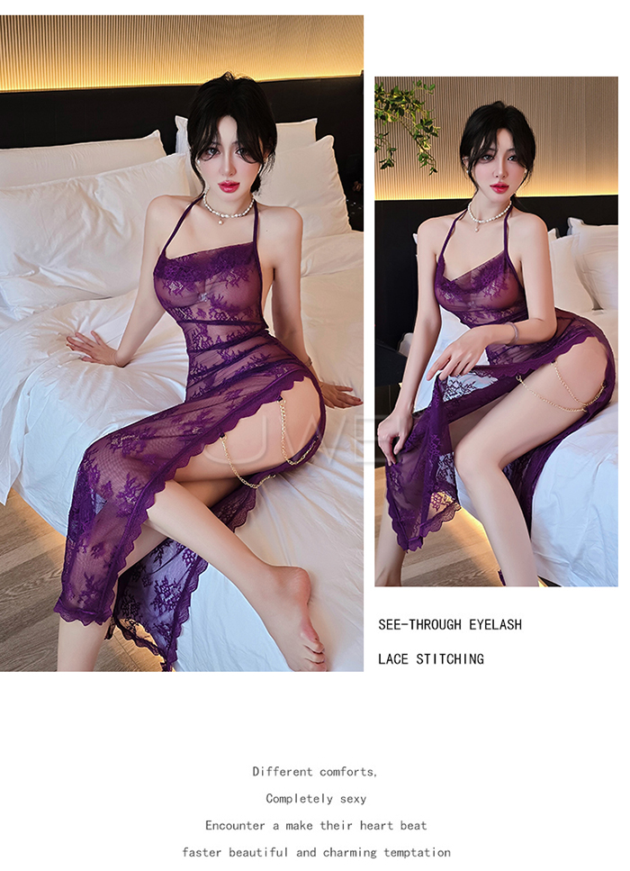 ►您現在的位置:首頁>柔欲佳人.蕾絲蕩領美背半露兩側開衩透視睡裙-藍色【連衣裙+T褲】