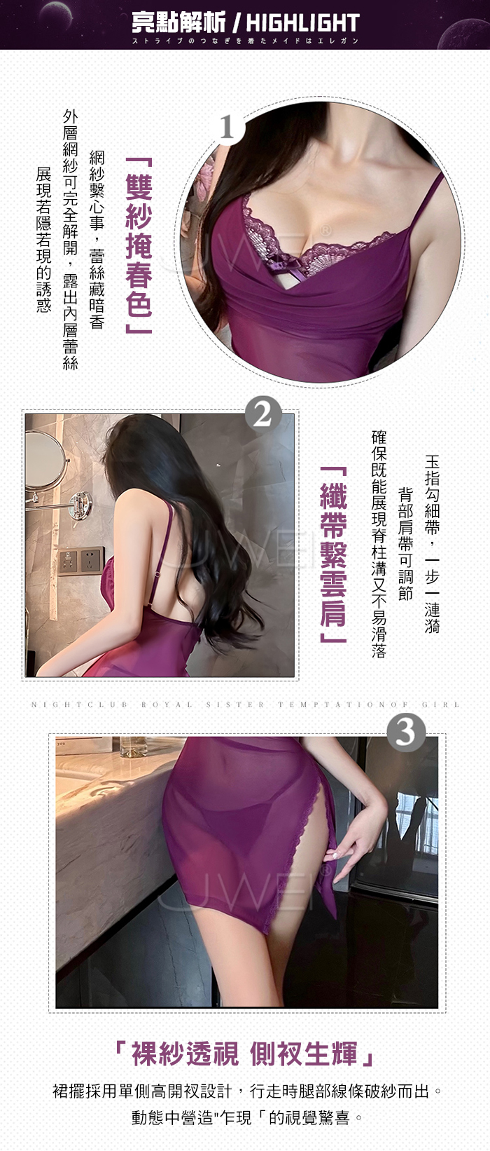 ►您現在的位置:首頁>月暮迷紗.性感裸紗蕩領透視側開衩細肩帶美背睡裙【睡裙+T褲-紫色】