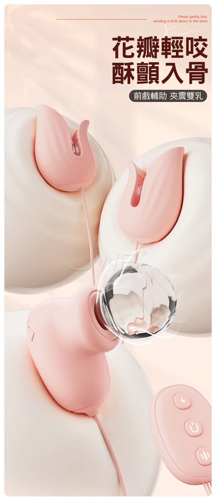 花瓣輕咬 酥顫入骨,前戲輔助 夾震雙乳,鬱金香花瓣 造型儀式感 微電流穿梭刺激,3速7頻10重維度,花式玩法不單調,柔軟矽膠材質 緊緻貼合 酥麻刺激,按摩凸點設計 刺激更進一步,感官統治 上夾下吸【乳夾+吸吮跳蛋】 旋轉刺激乳尖,脈沖吸附豆豆,讓痛感與快感在神經末梢共舞 ■尺寸:大小詳如圖片標示 ■材質:矽膠+ABS ■功能:10頻電擊+震動