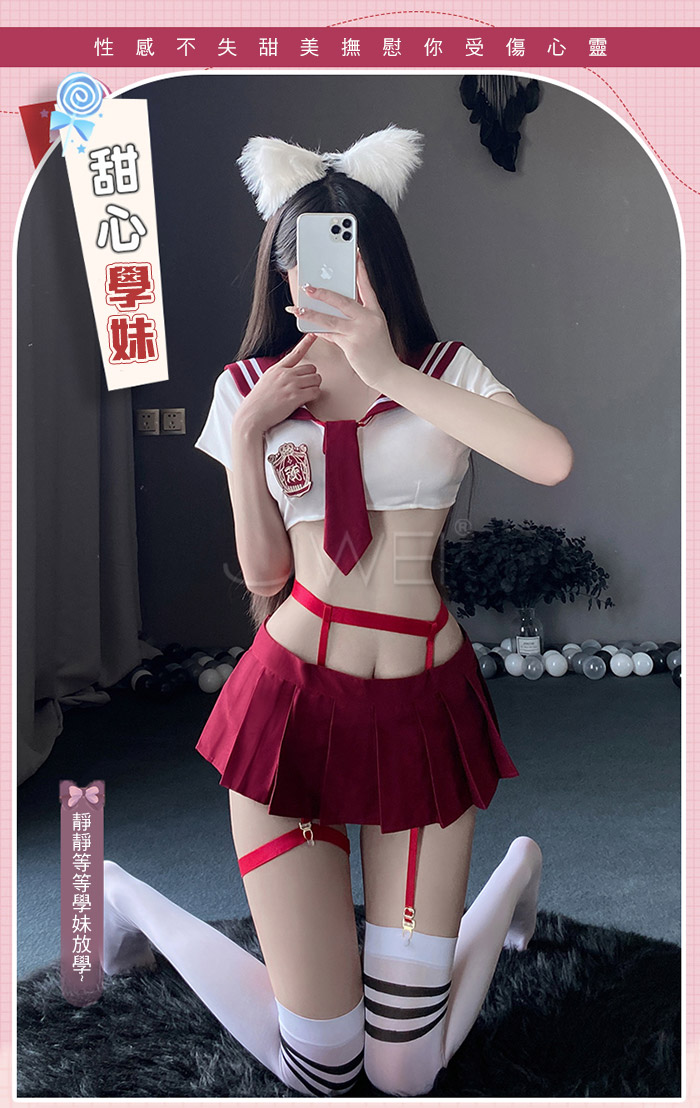 ►您現在的位置:首頁>甜欲學妹.日系校園純欲露腰齊臀JK套裝【上衣+領帶+連腰吊襪帶+百褶裙+腿環*1+T褲】