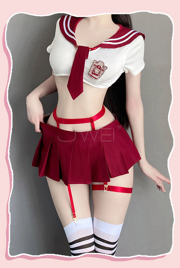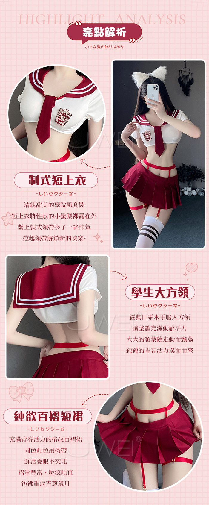| 甜欲學妹.日系校園純欲露腰齊臀JK套裝【上衣+領帶+連腰吊襪帶+百褶裙+腿環*1+T褲】