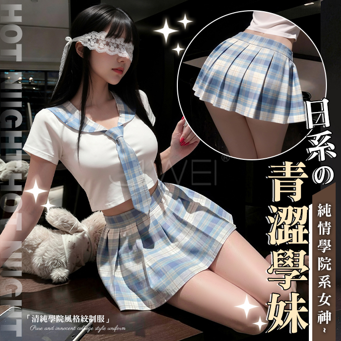 青澀學妹.日系格子領帶百褶裙 純情學院制服套裝【短上衣+領帶+百褶裙+T褲-白藍】